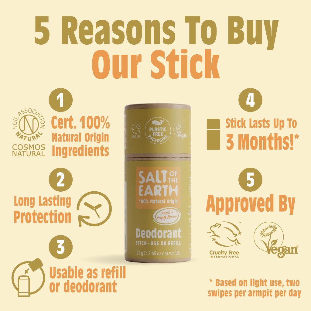 Providing reliable protection against body odour, Salt of the Earth's plastic-free Neroli & Orange Blossom natural deodorant stick is approved by Leaping Bunny, scented with natural botanical extracts, and endorsed by both the Vegan and Vegetarian Societies.