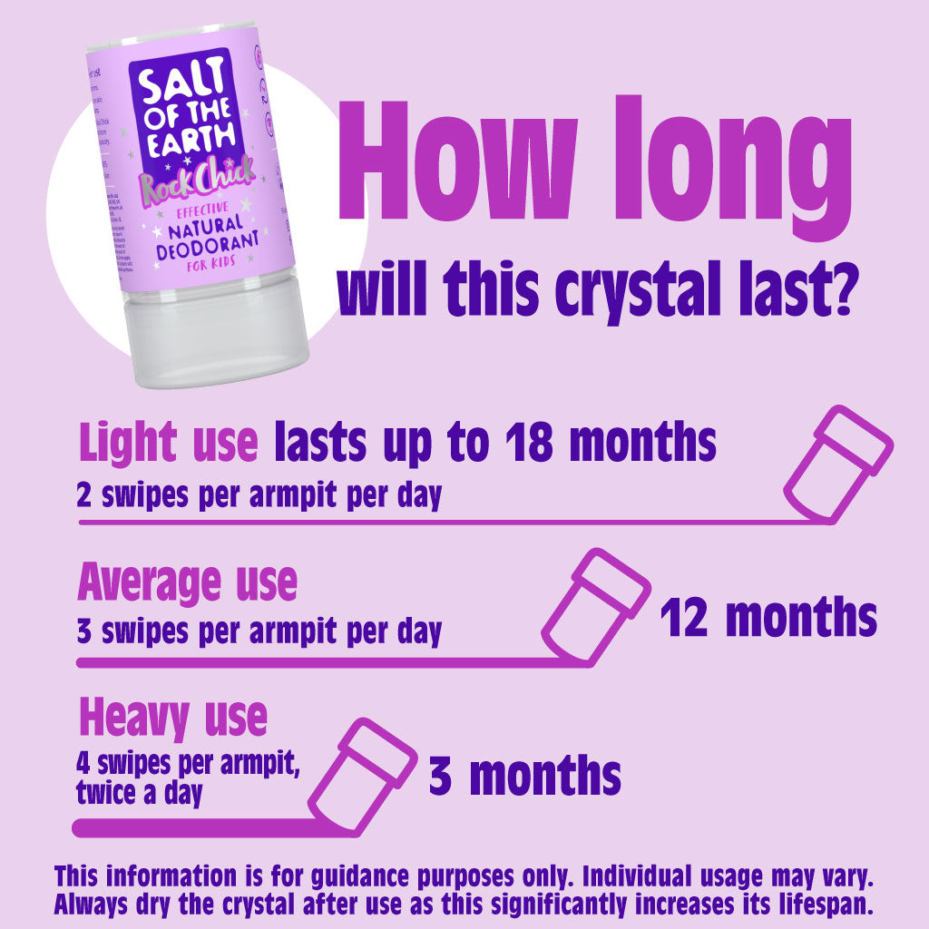 Our first natural deodorant for children, the Rock Chick Crystal Deodorant Stick, is ideal for those who have reached puberty early and are starting to notice changes in body odour.